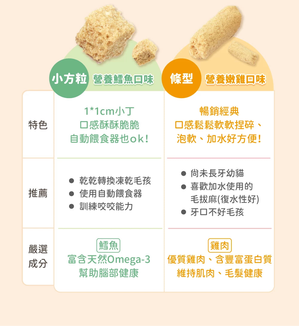 • 酥鬆顆粒,更好進食與消化吸收